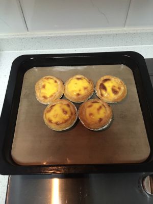 进烤箱,中层,220度,25分钟。要注意的是好了要立刻拿出来,否则烤箱的余温会将蛋挞烘胡了。