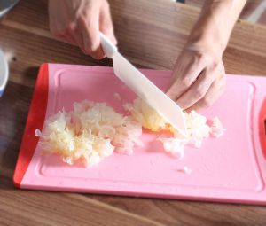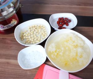 将银耳用冷水侵泡15分钟,待发后,去粗蒂,且小块备用。