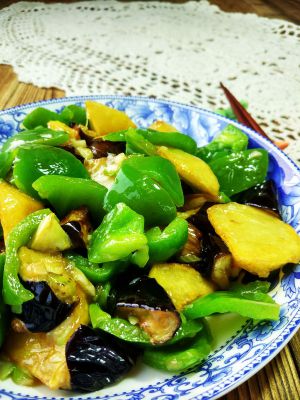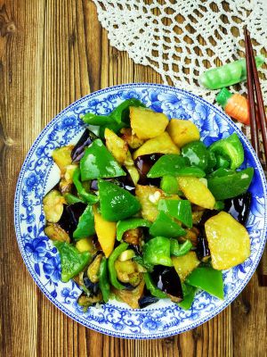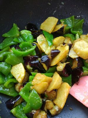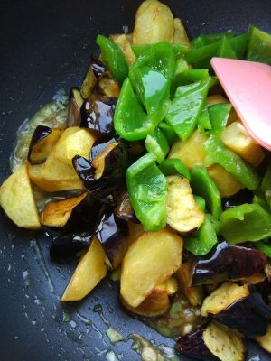 倒入少许油把葱姜青椒倒入翻炒下,再倒入土豆和茄子翻炒,加入盐糖,酱油翻炒下即可出锅!