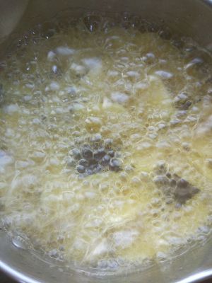 两汤匙油下锅,5成热时下土豆,翻炒,土豆变稍微透明,表面出现金黄色,沥干油装出。