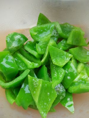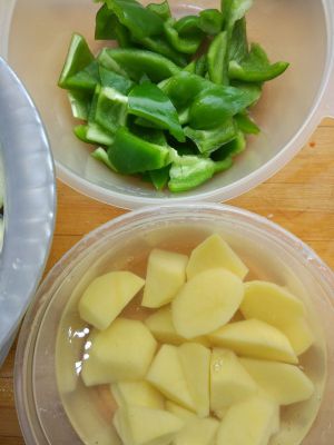 青椒洗净去蒂,切成或掰成块,土豆洗净,刮皮切滚刀块,泡在盐水里防止氧化变黑。