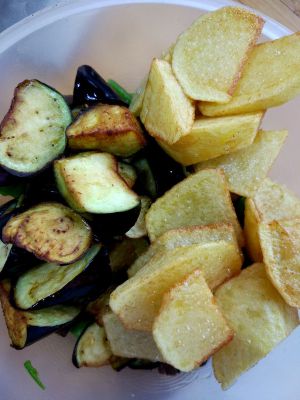沥净余油,盛出备用。同时将油温升至六七成,投入土豆块和茄子。