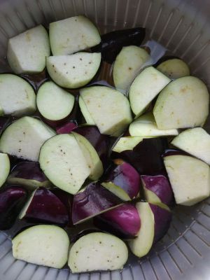 茄子洗净,切滚刀块,洒少许盐搓揉一下,或者泡在盐水里。这样茄子不容易氧化,且容易入味。