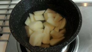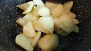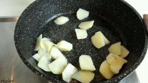 不粘锅锅中放入少许油,放入土豆,煎至变色