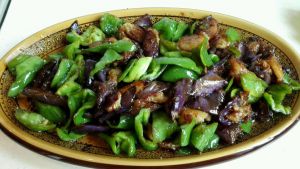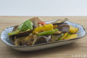 锅内放少许油 等油热后放入姜沫葱花 加入少许生抽 一品鲜 将切好的辣椒放入翻炒再加入过油的茄子和土豆一起翻炒几分钟 然后加入盐拌匀 继续翻炒