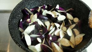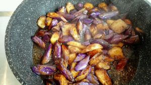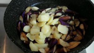 加入一勺油,倒入茄子,和土豆一起不停翻面煎至熟透