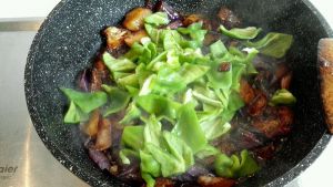 锅里再加点油,将茄子倒入,让茄子吸饱油。