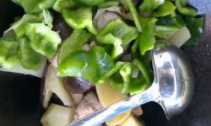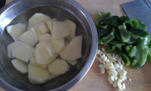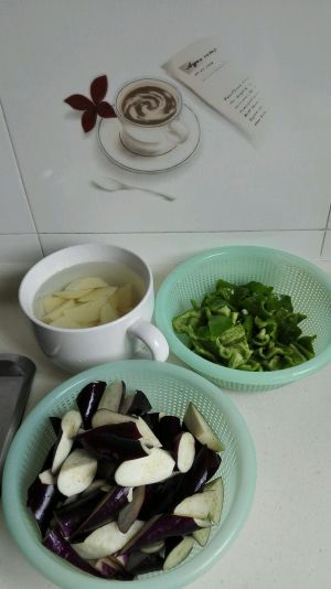 土豆去皮洗净切块浸泡着备用,尖椒洗净切块备用,茄子洗净切滚刀块备用。