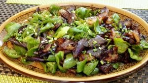 再撒上一点葱花做装饰,好吃的地三鲜就做好了。