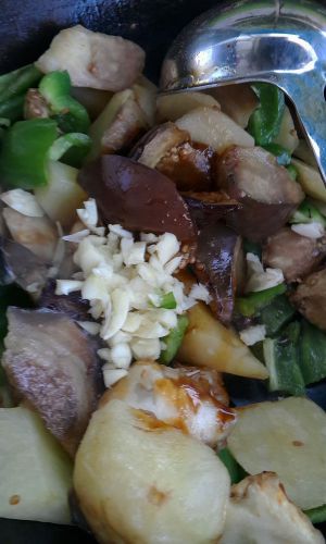 热油锅,放入大蒜爆香,再将煎好的土豆、茄子放入一起翻炒3-4min,加少量水焖1-2min,直至水份收干。