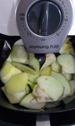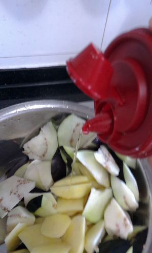 将茄子和土豆放在一起,拌入少量油,但是,要保证,每块都沾上油。