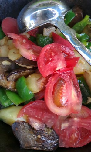 再把西红柿,彩椒放入,淋上少许香油,待西红柿软烂后,即可出锅。