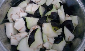 茄子切成斜棱块,这有一点需要注意,切好的茄子,要泡水,过两遍。不然,茄子表面会变色。