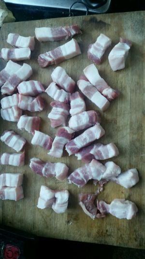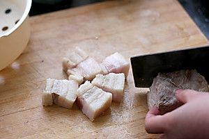 带皮五花肉切大块。注意:一盘成功的红烧肉,选材很关键,选择五花肉时一定要选择带皮的,肥瘦适宜,层次分明的。所谓五花,就是一定要一层肥一层瘦,足有五层的才是好的五花肉,有的五花肉只有三层,肥的部分特厚,那都不是好的五花肉