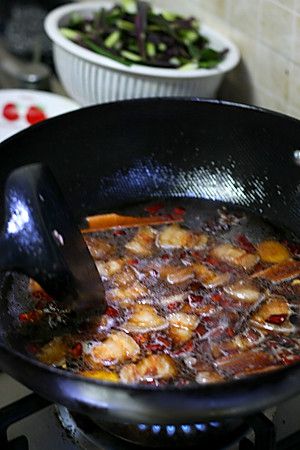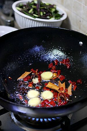 锅中留底油,下入生姜,桂皮八角,干尖椒,炒香