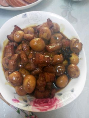 开大火,放入少许油,[放一点点就可以,五花肉在炒制的过程中会出油],放入蒜,姜,大料炒香,改成小火,放入五花肉,来回翻炒,可以多炒一会,之后加入准备好的鹌鹑蛋,继续翻炒,之后加入开水,大概两碗左右,根据锅不同,加水多少适量,以没过肉稍微多一点即可,加入红烧酱油上色。