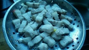 捞出过冷水冲凉,这样是为了让肉皮紧致有弹性,然后改刀成正方小块