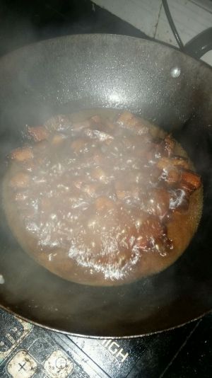 至水份差不多收干时,捡去生姜,八角,桂皮等,然后改大火翻炒,直至水分完全收干,油和糖均匀挂在肉上形成油亮的芡汁,即可起锅装盘了