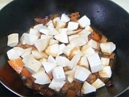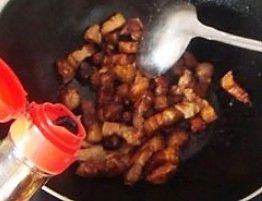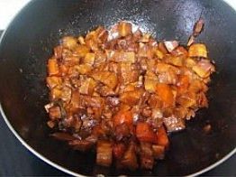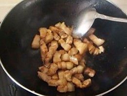 加入花生油,温油肉块下锅大火煸炒,少则十分钟,待把肥肉中的油基本煸出为止。
