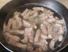 五花肉洗净、切块,加冷水、姜3片、料酒少许浸泡1小时冲洗,再冷水下锅焯水,开锅5分钟后洗净控干。