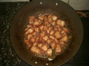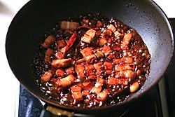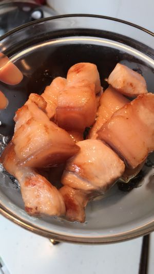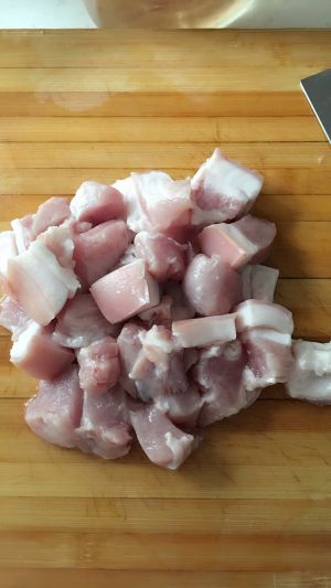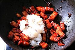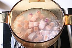 锅烧热后小火加入五花肉块,煸出里面的油脂