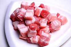 五花肉加水煮沸,撇去浮沫,捞出肉块,沥干水分