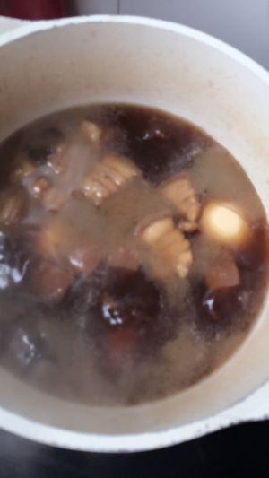 高压锅里放肉块,葱段,姜块,烧开了的黄酒,酱油,压8分钟