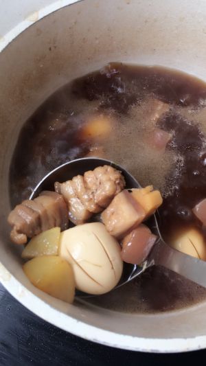 小火焖煮后 大火收汁 起锅前倒入土豆翻炒 夹出调料丢掉 装盘