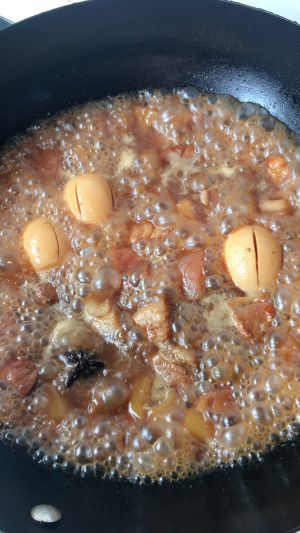 锅中放少许油炒白糖发泡变色时放入少许开水制成糖色,煸香葱姜蒜,放入五花肉煸炒出香味,放入花椒、大料、桂皮、干辣椒,烹入料酒稍微放入老抽调好颜色,烹入开水,大火烧开,小火炖约40分钟。