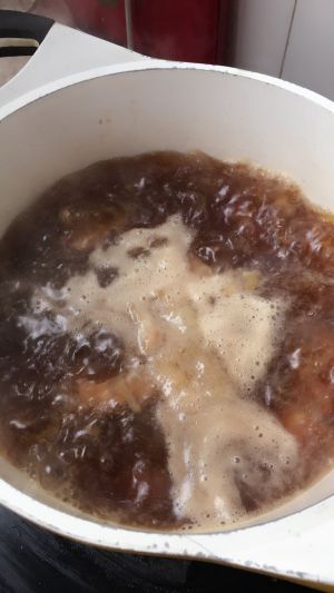 锅内留少许底油 倒入冰糖 炒至焦黄(不停搅拌)