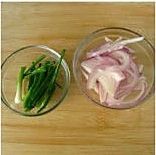 1、牛肉切小块,用少许花生油、酱油研制十分钟;2、葱切段;3、芽菜洗干净。备用