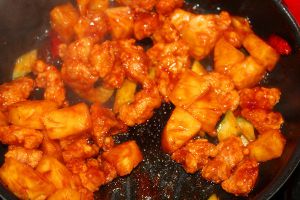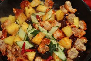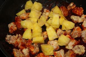 一点热油,煎好的里脊肉,青红椒翻炒,倒入调好的酱汁煮沸腾至收汁,待差不多收好汁时倒入泡好的菠萝块,翻炒均匀5分钟