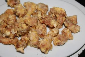 先撒盐和料酒腌制10分钟再倒入鸡蛋2个拌匀然后放上生粉后在油锅里炸一会