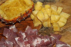 准备食材,将猪里脊切片(3毫米左右厚度),菠萝切成小块。