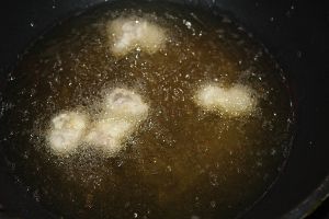 油锅烧至六成热下入肉团,炸至金光捞出。
