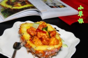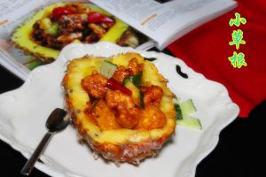 收汁好了就开吃啦☺装在菠萝壳里既美观也不用洗碟子啦哈哈哈 一个菠萝可做两道菜另一道~菠萝炒饭~在上一篇菜谱