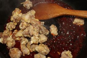 另起锅加少许油,葱姜煸出香味加番茄酱、醋、白糖、少许盐,加入炸好的肉团翻炒。