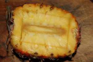 菠萝用勺子挖开,放入盐水浸泡20分钟