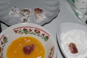 菠萝切块,肉切块。肉切块,用葱姜泡水腌制肉,肉里放少许盐,大约10分钟