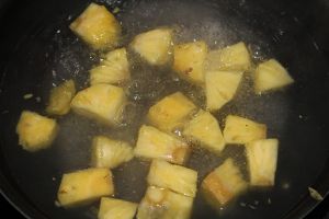 将切好的菠萝块下锅一起迅速翻炒均匀,出锅装盘即可。