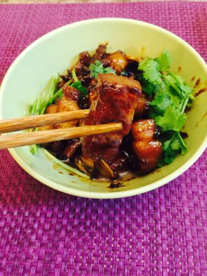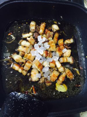 锅内加2勺白糖,翻炒至褐色,倒入五花肉,葱姜八角干辣椒,继续翻炒,加入冰糖,生抽少许,水没过五花肉,小火煮30分钟,加大火收汁即可