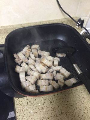 热锅凉油,把五花肉、葱段、姜片、料酒,入锅煸炒变色。