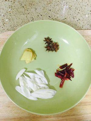 八角3粒,姜切片 ,葱切好,干辣椒切好,备料