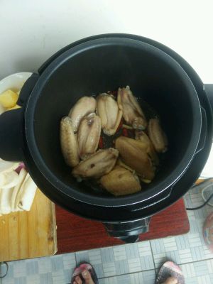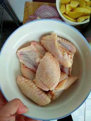 在原锅里加入洋葱和土豆,翻炒一会后,铺平,加入那一层杏鲍菇,和一层鸡翅,加入调味料,酒,生抽,白糖,盖上开始炖