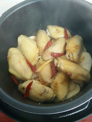 油烧热,加姜花椒和辣椒爆香,加入鸡翅,两面金黄盛起
