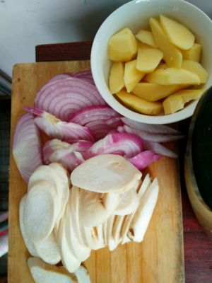 加入土豆丁、洋葱丁、香菇云耳丁,料汁、姜片蒜片一起中小火焖