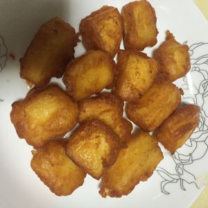 3.锅内放油烧至七成热,下苹果块,炸至苹果外皮脆硬,呈金黄色时,倒出沥油。