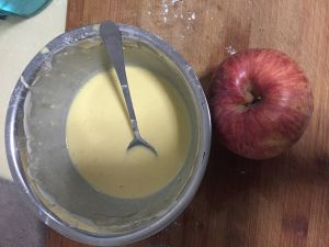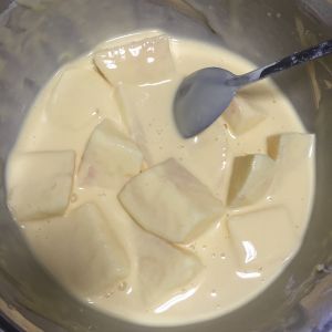 2.鸡蛋打碎在碗内,加干淀粉、清水调成蛋糊,放人苹果块挂糊。