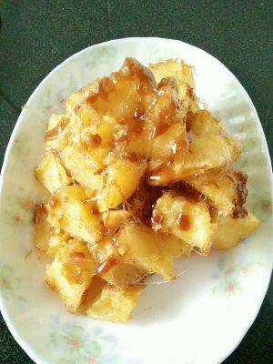 我没拍油锅,锅内留少许油,加入适量白糖,一直滑动白糖,直到糖浆变成粘稠黄色,把火关掉,苹果放进去,翻炒几下,出锅