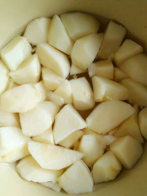 苹果削皮切块,放2勺盐, 加水泡上5分钟以免苹果氧化发黄